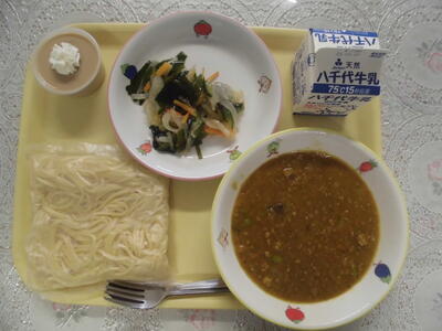 今日の献立は、スパゲティー、カレーミートソース、海藻サラダ、キャラメルプリン、牛乳です。
