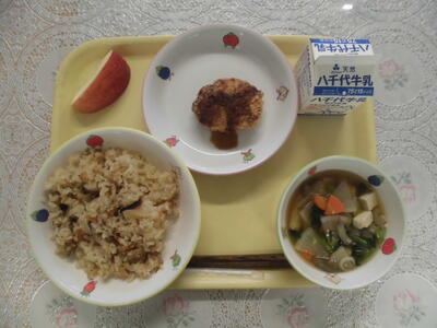 今日の献立は、ひじきふりかけご飯、ほうれん草とツナの和え物、卵と豚のはちみつ煮、おふのラスク、牛乳です。
