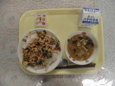今日の献立は、里芋そぼろ煮、磯和え、手作りふりかけ(鮭)、ごはん、みかんゼリー、牛乳です。