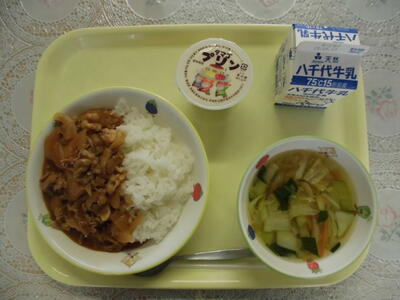 今日の献立は、豚肉のネギみそ焼き、こんにゃくの炒り煮、ごはん、けんちん汁、牛乳です。