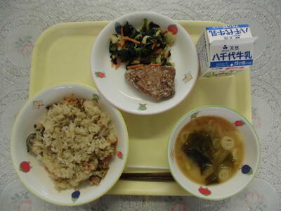 今日の献立は、五目ごはん、かつおの竜田揚げ、おかか和え、みそ汁、牛乳です。