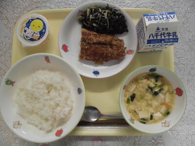 今日の献立は、さんまの蒲焼、磯和え、かきたま汁、ごはん、十五夜ゼリー、牛乳です。