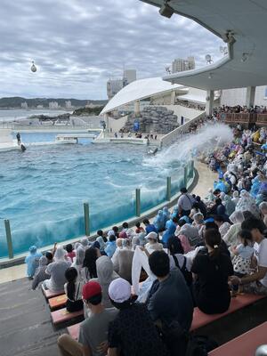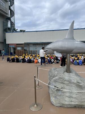 昼食はみんな美味しそうに食べていました。シャチのショーでは、水を浴びながら楽しんでいる子もいました。