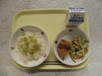 今日の献立は、ひじきごはん、ししゃもの磯辺揚げ、白菜のおかか和え、若鳥のみそ煮、ジョアです。