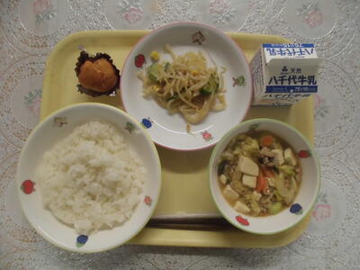 今日の献立は、中華五目豆腐、もやしのサラダ、ごはん、オレンジおからドーナツ、牛乳です。