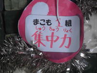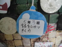 廊下壁面の卒業制作をクリスマスツリーに見立てて、各クラスのつけたい力と個人個人の願い事をオーナメントにして飾りました。