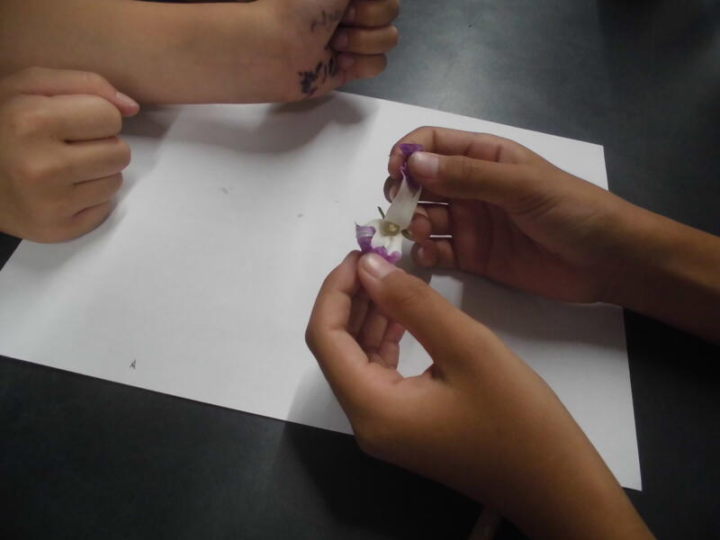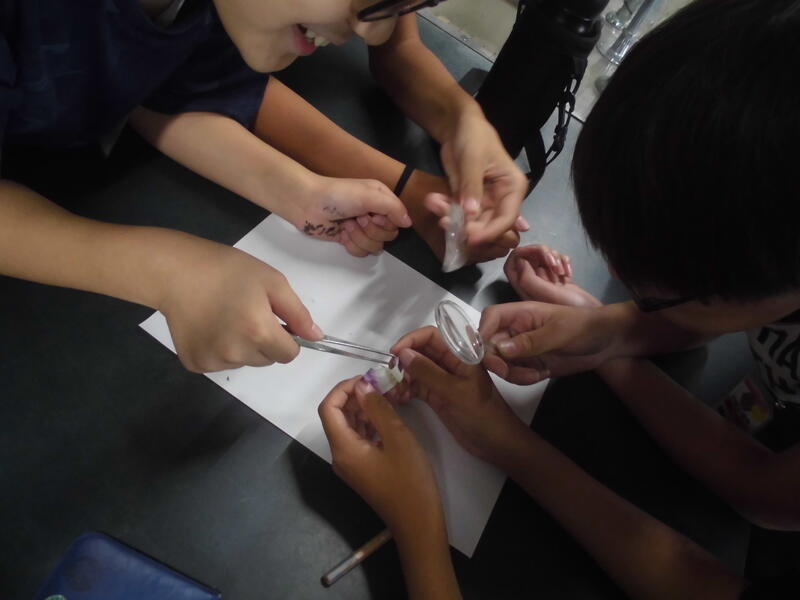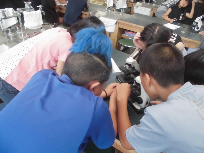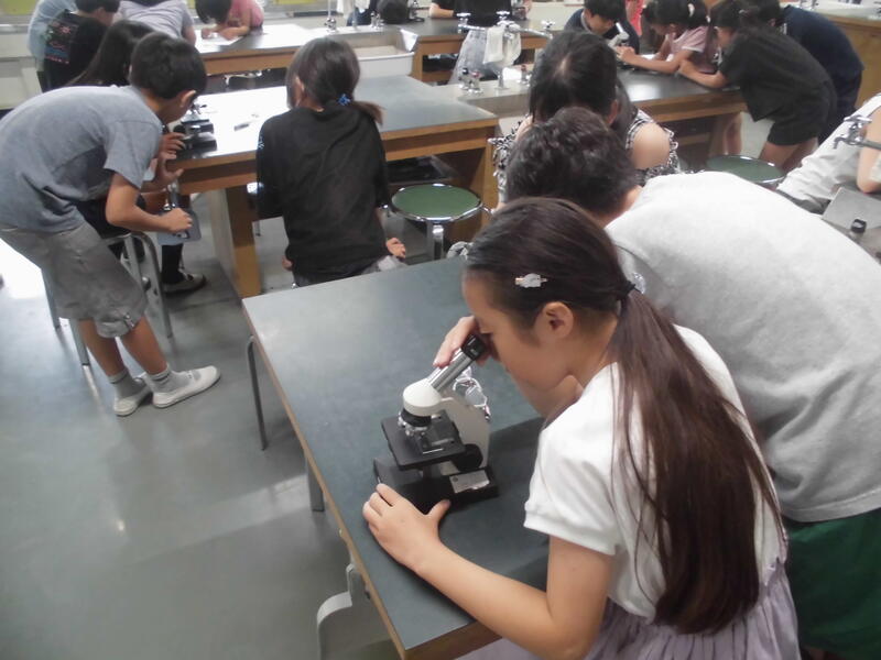 5年生が理科室で朝顔のめしべとおしべを観察していました。