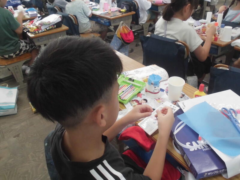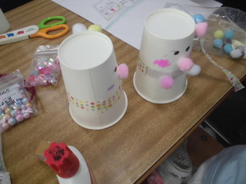 3年生が、お神輿集会で使う「ばかめん」を作っていました。