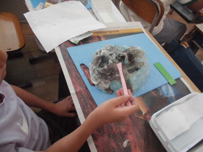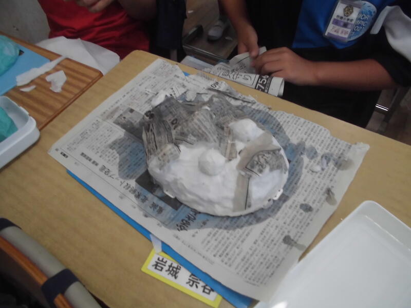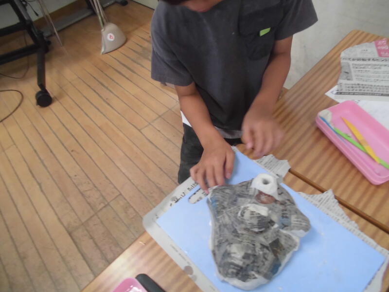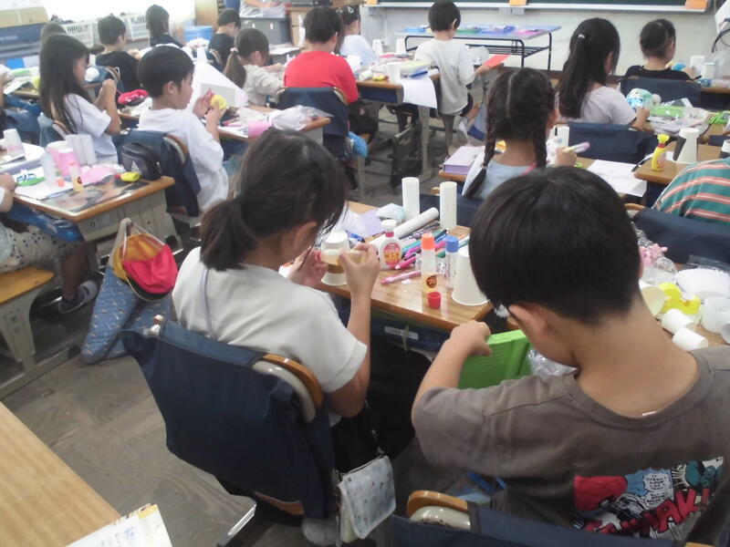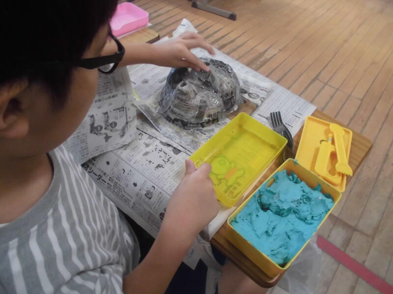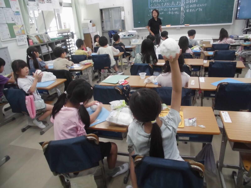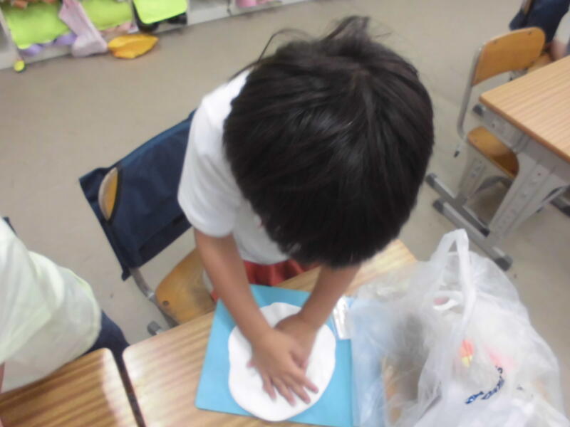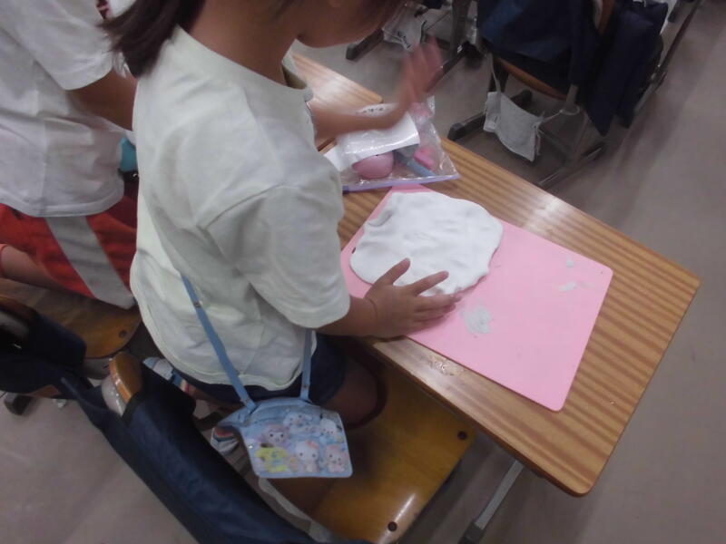 1年生が図工科の授業で、紙粘土をこねて、伸ばしていました。