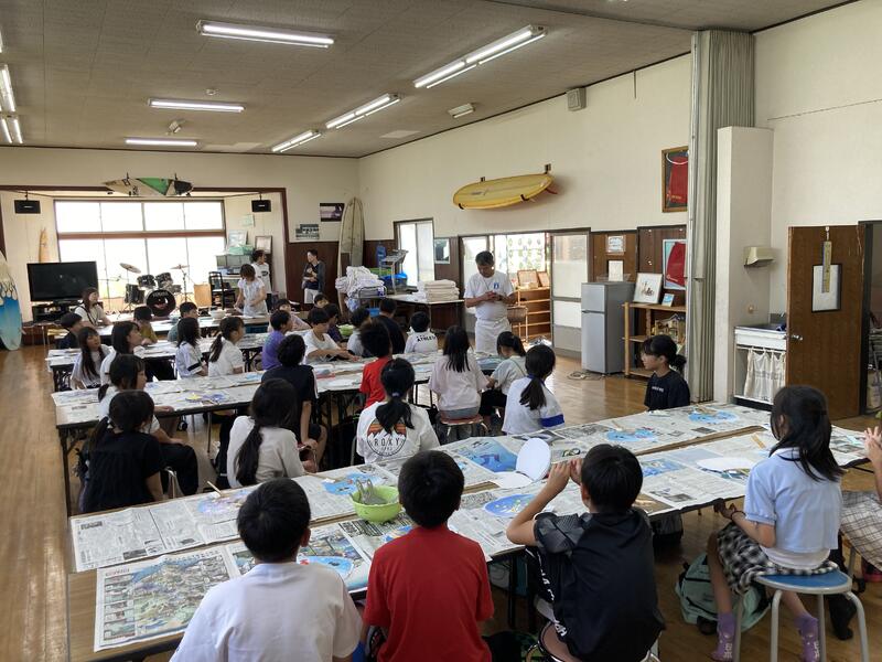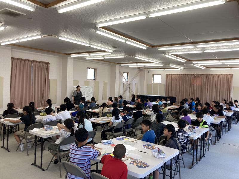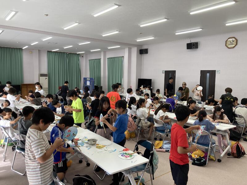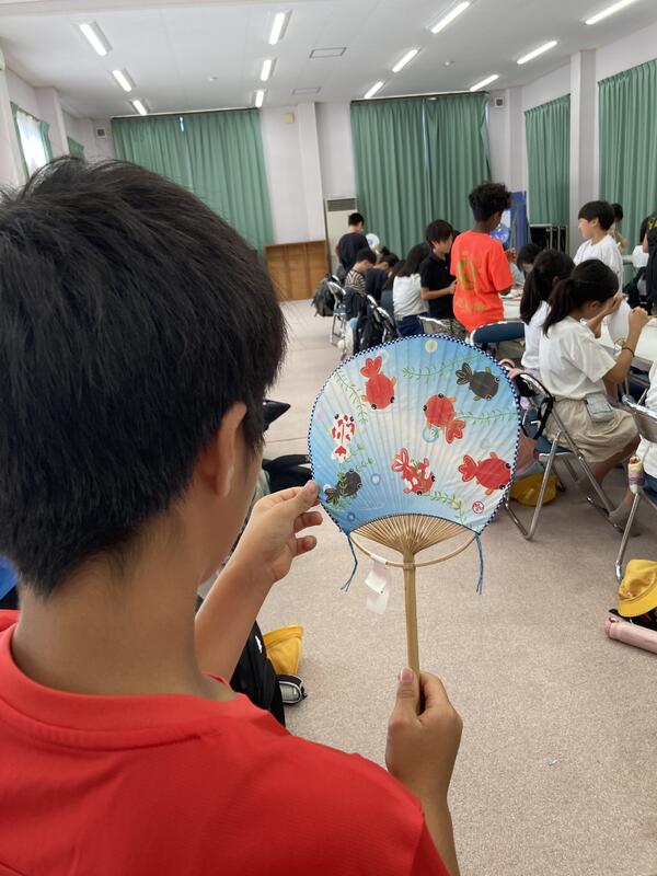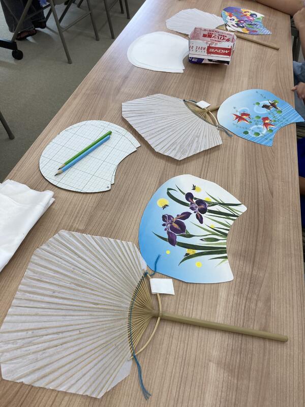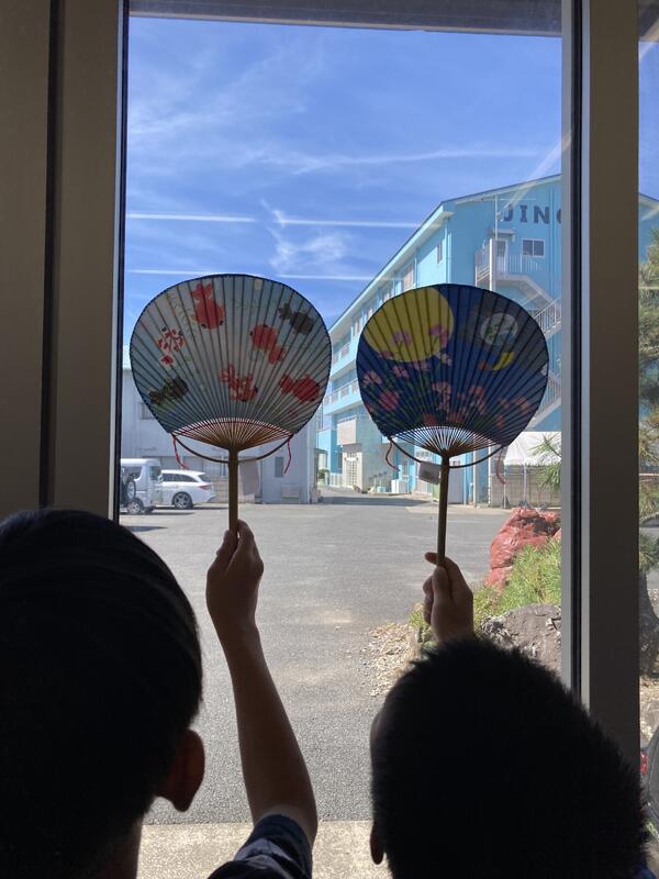 予定していた地引網体験は海が荒れている為中止となり、房州うちわ作り体験をしています。