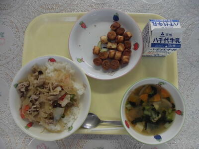 今日の献立は、いわしの蒲焼き、磯和え、豚汁、ごはん、牛乳です。