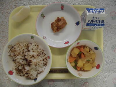 今日の献立は、おかかふりかけごはん、タンドリーチキン、肉じゃが、梨(新高)、牛乳でした。