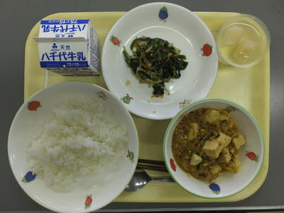 ごはん、麻婆豆腐、ナムル、ピーチゼリー、牛乳です。
