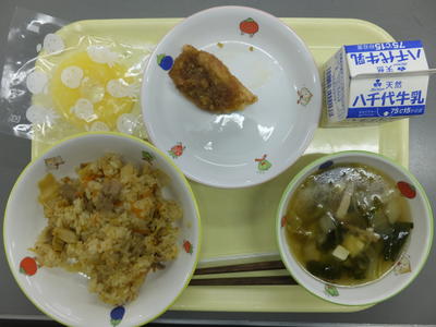 キムチごはん、鶏肉の香味揚げ、白菜スープ、冷凍パイン、牛乳です。