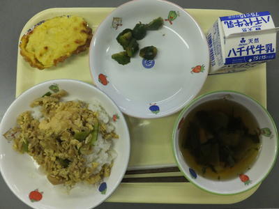 あぶたま丼、きゅうりのかわり漬け、すまし汁、スイートポテト