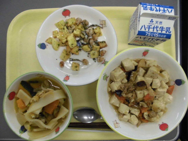 ほうとううどん、五目豆腐、青のりポテトビーンズ、牛乳です。