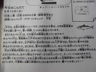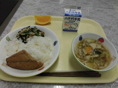 献立:納豆ご飯、鯖の味噌煮、せんべい汁、オレンジ、牛乳!