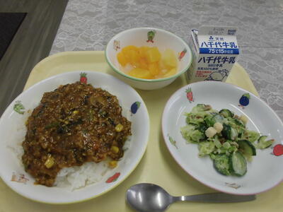 献立:ご飯、コーンドライカレー、シーザーサラダ、フルーツポンチ、牛乳!