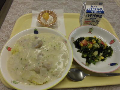 献立:チキンドリア、小松菜とコーンのサラダ、桃のタルト、牛乳!