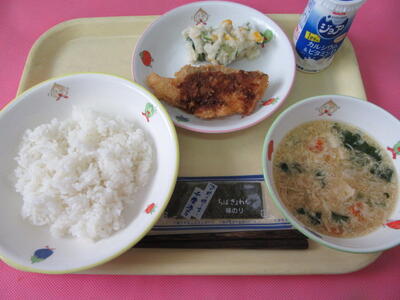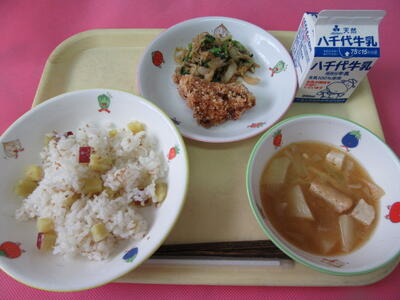 本日の献立は、さつまいもご飯・鯖の立田揚げ・ごま和え・味噌汁・牛乳です。