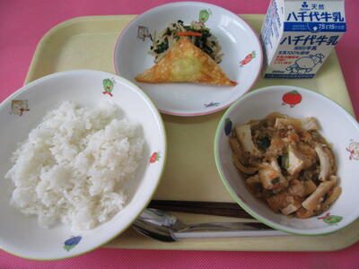 本日の献立は、ご飯・生揚げ入りマーボー春雨・揚げワンタン・ナムル・牛乳です。