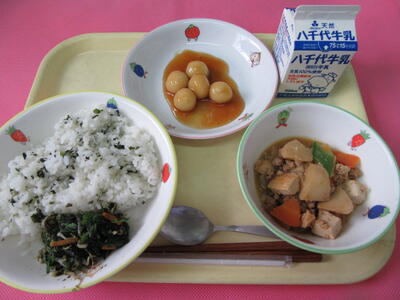 本日の献立は、しらすわかめご飯・里芋のそぼろ煮・磯和え・月見団子・牛乳です。