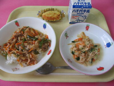 本日の献立は、チンジャオロース丼・バンバンジー・スイートポテト・牛乳です。