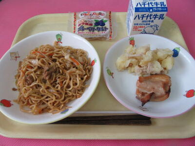 本日の献立は、ソース焼きそば・鶏肉のはちみつレモン焼き・ジャーマンポテト・