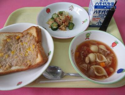 本日の献立は、ツナコーントースト・唐揚げサラダ・ミネストローネ・