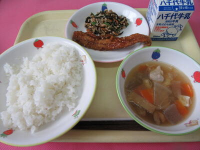 本日の献立は、ご飯・秋刀魚のかば焼き・納豆和え・吉野汁・牛乳です。