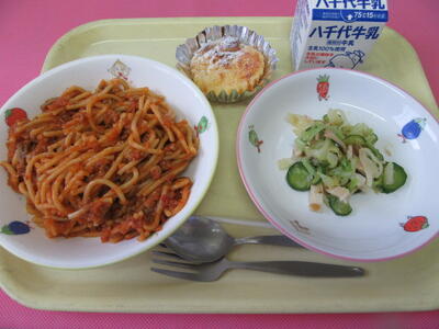 本日の献立は、スパゲティミートソース・イタリアンサラダ・チーズケーキ・牛乳です。