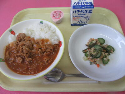 本日の献立は、ハヤシライス・茎わかめサラダ・ひとくちいちごプリン・牛乳です。