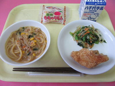 本日の献立は、みそラーメン・鶏のから揚げ・ナムル・お米でももタルト・牛乳です。