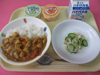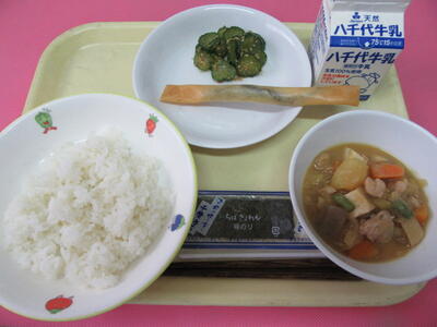 本日の献立は、里芋カレー・コールスローサラダ・セレクトゼリー(みかんかラフランス)