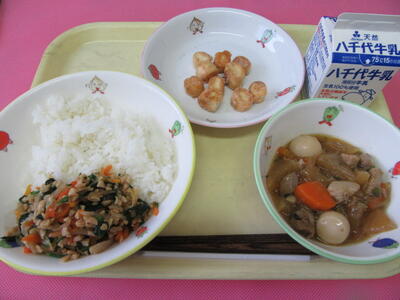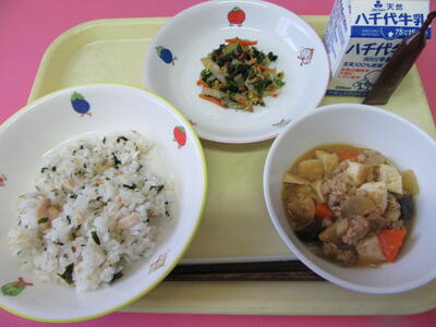 本日の献立は、鮭わかめご飯・生揚げの肉みそ煮・おかか和え・ミルメークココア・牛乳です。
