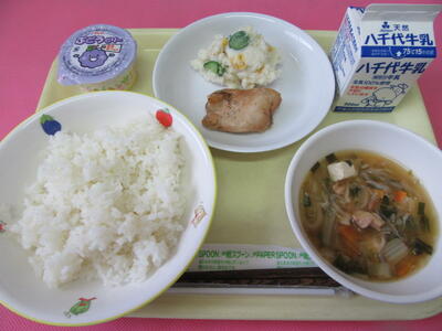 本日の献立は、ご飯・鶏肉のスパイス焼き・ポテトサラダ・キムチ鍋汁・ゼリー・牛乳です。