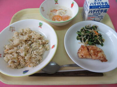 本日の献立は、チャーハン・赤魚の香味揚げ・ナムル・フルーツヨーグルト・牛乳です。