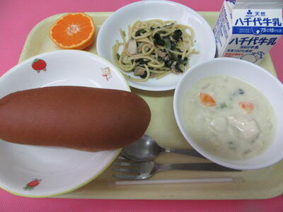 本日の献立は、黒糖パン・里芋シチュー・ほうれん草のバター醤油パスタ・花みかん・牛乳です。
