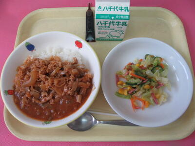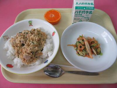 本日の献立は、親子丼・パリパリサラダ・花みかん・牛乳です。