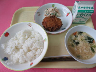 本日の献立は、ご飯・メンチカツ・大根ツナサラダ・かきたま汁・牛乳です。