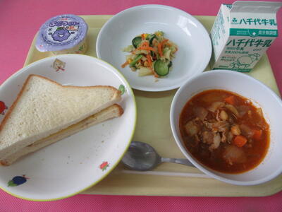 本日の献立は、ハムチーズトースト・ポークビーンズ・ツナサラダ・ぶどうゼリー・牛乳です。