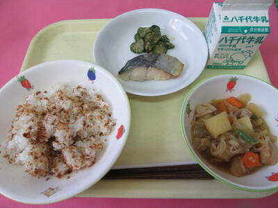 本日の献立は、おかかふりかけご飯・鰆の西京焼き・ごまきゅうり・肉じゃが・牛乳です。