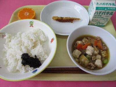 本日の献立は、ご飯・きびなごフライ・肉豆腐・市川の海苔佃煮・花みかん・牛乳です。