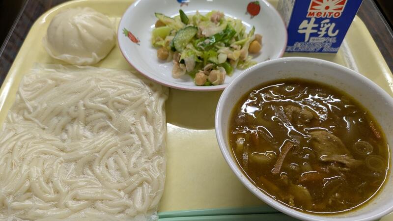 カレーうどん ひよこ豆のサラダ 肉まん 牛乳