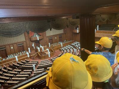 9:00 国会に入ると子供達は真剣モードに。一番目を輝かせていたのは、衆議院議場です。教科書やテレビで見たことがある場所を間近に見て、自然と学習したことをつぶやく姿が見られました。