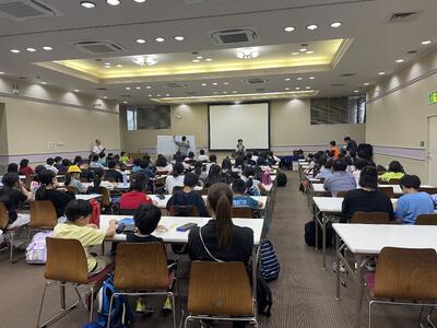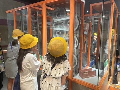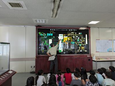 本日も暑い中ですが、4年生が市川市クリーンセンターに校外学習に来ております。まず始めにみんなでビデオ視聴をし、二手に分かれて施設内を見学します。こちらのグループはパネルを見ながら、ごみ処理の説明を受けています。
