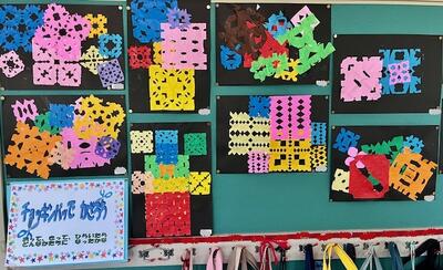 大きさの違う折り紙を四角や三角に折って、いろいろな所を切って開くと不思議な模様ができあがることを楽しんだあと、黒い台紙に貼りました。貼る向きも工夫した素敵な作品が廊下に掲示されています。
