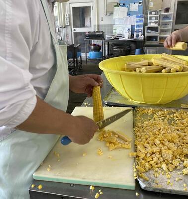 集まったトウモロコシは、調理員さんが…。カット済みの芯だって出汁が出るので一緒に炊き込みます。