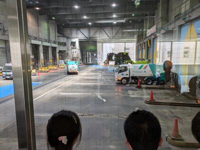 10:10 施設内を少しずつ進んでいきます。ゴミの捨て方の気をつけ方を聞いたり、プラットフォームでのゴミ収集車の様子を見たりしています。ゴミ収集車が次から次へと入ってくる様子には思わず歓声が上がっていました。