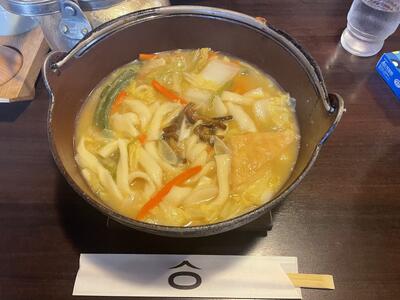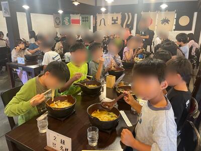 12:00 昼食は、大人気店のほうとう不動へ。大盛りの熱々ほうとうを食べています。「完食しました!」と教えてくれる子がたくさんいます。
